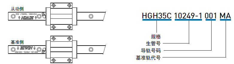 當(dāng)非互換型直線導(dǎo)軌配對使用時,需注意基準(zhǔn)軌與從動軌之差異。基準(zhǔn)軌側(cè)邊基準(zhǔn)面精度較從動軌高,可作為床臺安裝承靠面。基準(zhǔn)軌上有刻上MA之記號,如圖所示。