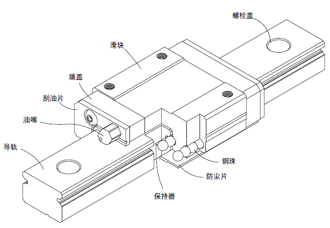 滾動循環(huán)系統(tǒng):滑塊、導軌、端蓋、鋼珠、保持器