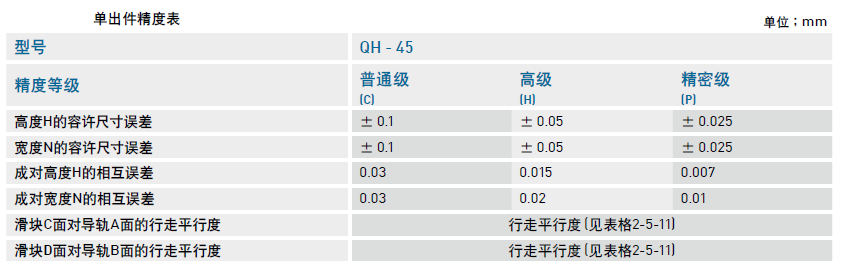 QH系列直線導(dǎo)軌的精度,分為普通、高、精密、超精密、超高精密級共五級,客戶可依設(shè)備精度需求選用精度。