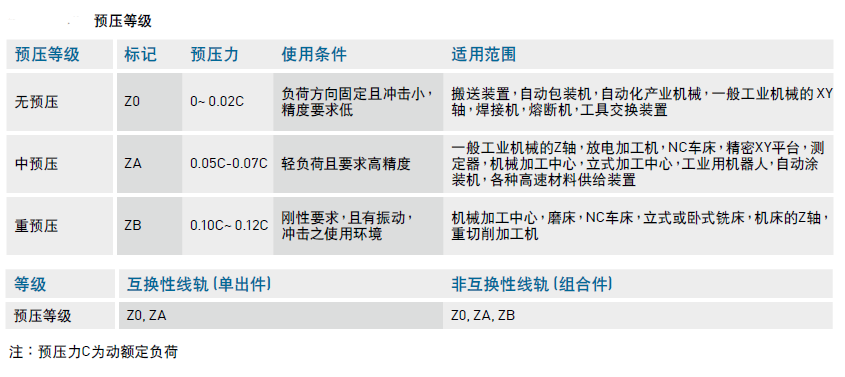 QH 系列直線導軌提供三種標準預壓,可依據用途選擇適當預壓力。
