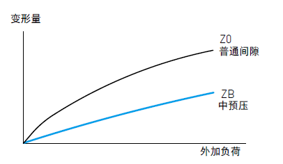 預壓力是預先給與鋼珠負荷力,亦即加大鋼珠直徑,利用鋼珠與珠道之間負向間隙給與預壓,此舉能提高直線導軌的剛性及消除間隙;以下圖來解釋,提高預壓力可增加直線導軌剛性。但小規格建議選用輕預壓以下預壓,以避免因預壓選用過重降低其使用壽命。