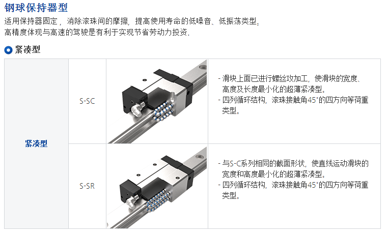 S系列使用四列鋼珠承受負荷設計,使其具備高剛性、高負荷的特性,同時具備四方向等負載特色、及自動調心的功能, 可吸收安裝面的裝配誤差,得到高精度的訴求。 加上降低組合高度及縮短滑塊長度,非常適合高速自動化產業機械及空間要求的小型設備使用。